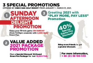 With all these preventive measures to cope with the spread of the COVID-19, golf enthusiasts can still enjoy their golf games with Chee Chan Golf Resort with the current three offered promotions. Firstly, it is the continuation of its “Play More, Pay Less” with 40% green fee discount plus an additional discount when inviting friends to play a round of golf on weekdays, at weekends and on public holidays. When playing two persons and more, each player gets a greater discount, starting from 100 Baht up to 400 Baht.